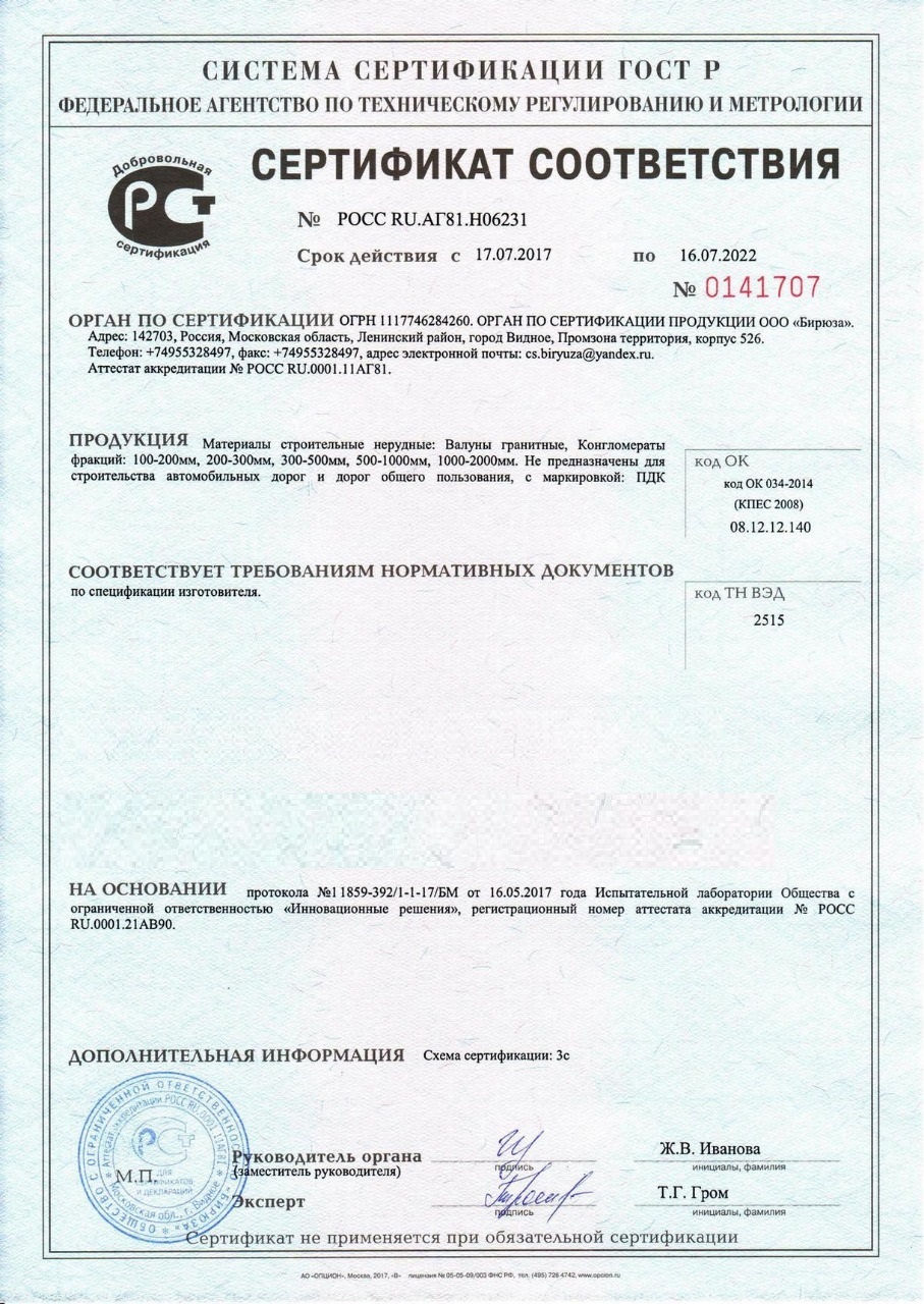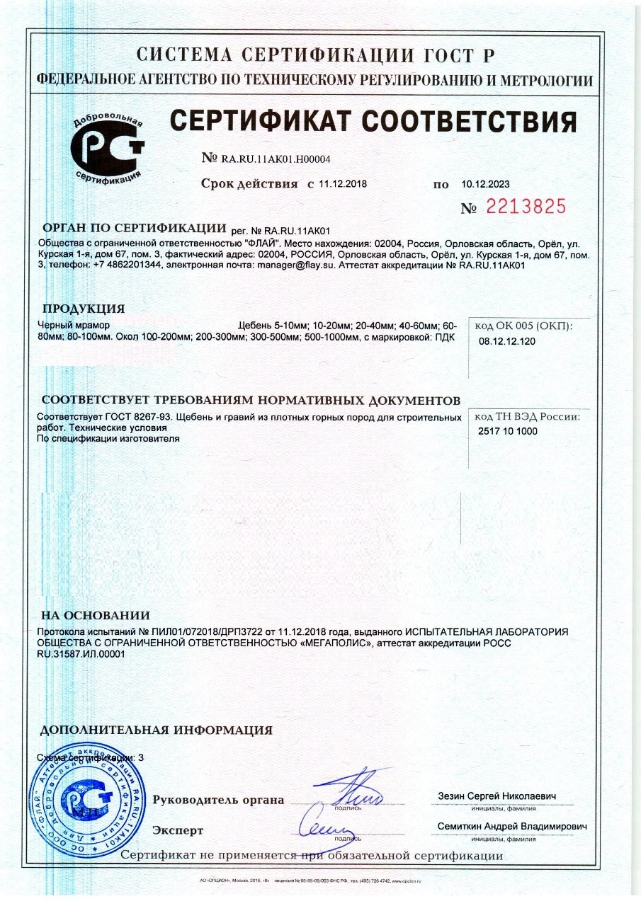 Сертификат соответствия – документ, подтверждающий соответствие продукции требованиям качества и безопасности, установленными для нее действующими стандартами и правилами. Наш камень, который Вы сможете заказать с доставкой в Тольятти , обладает всеми необходимыми документами для реализации и при необходимости могут быть предоставлены все необходимые подтверждающие документы при поставке.